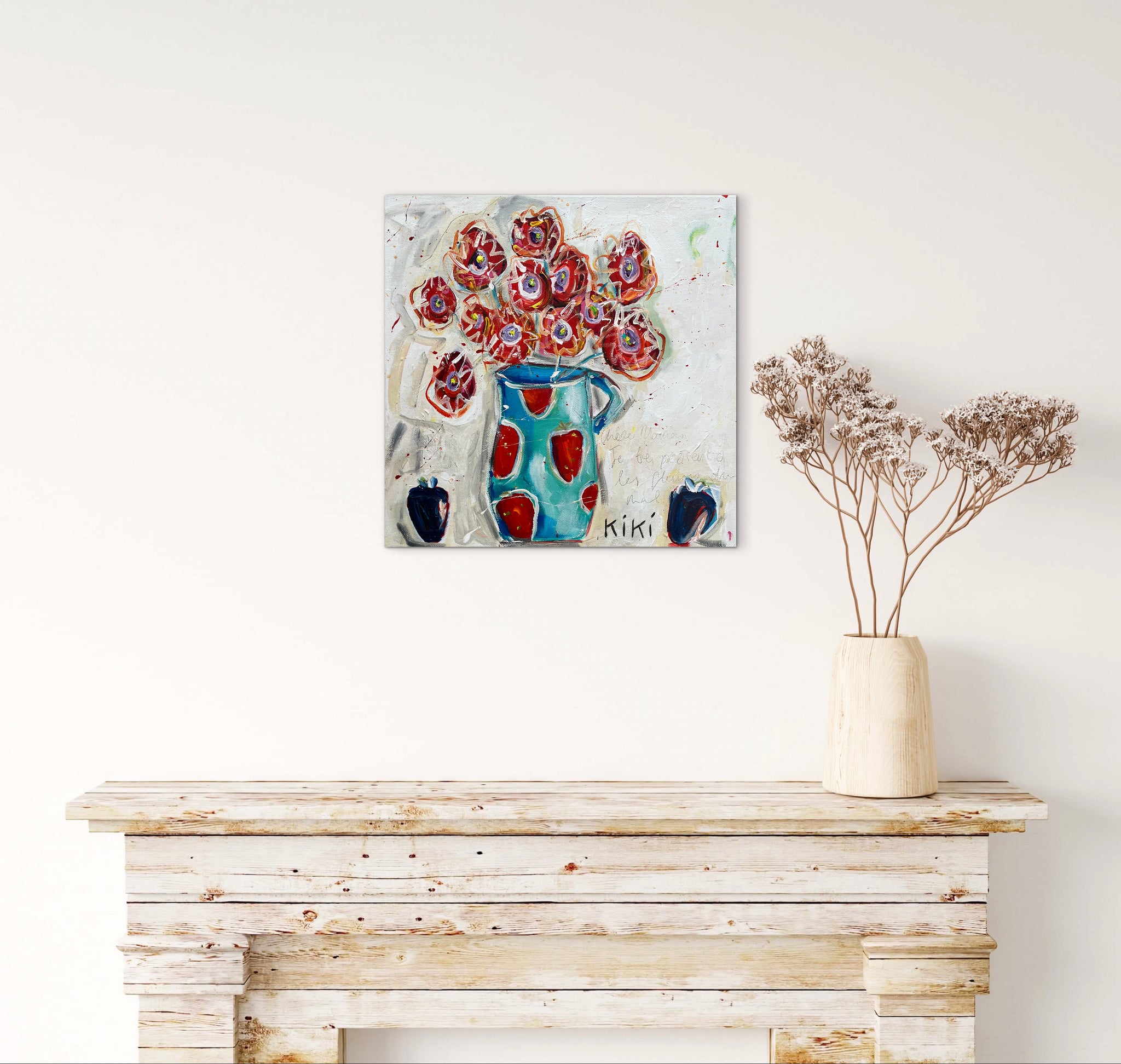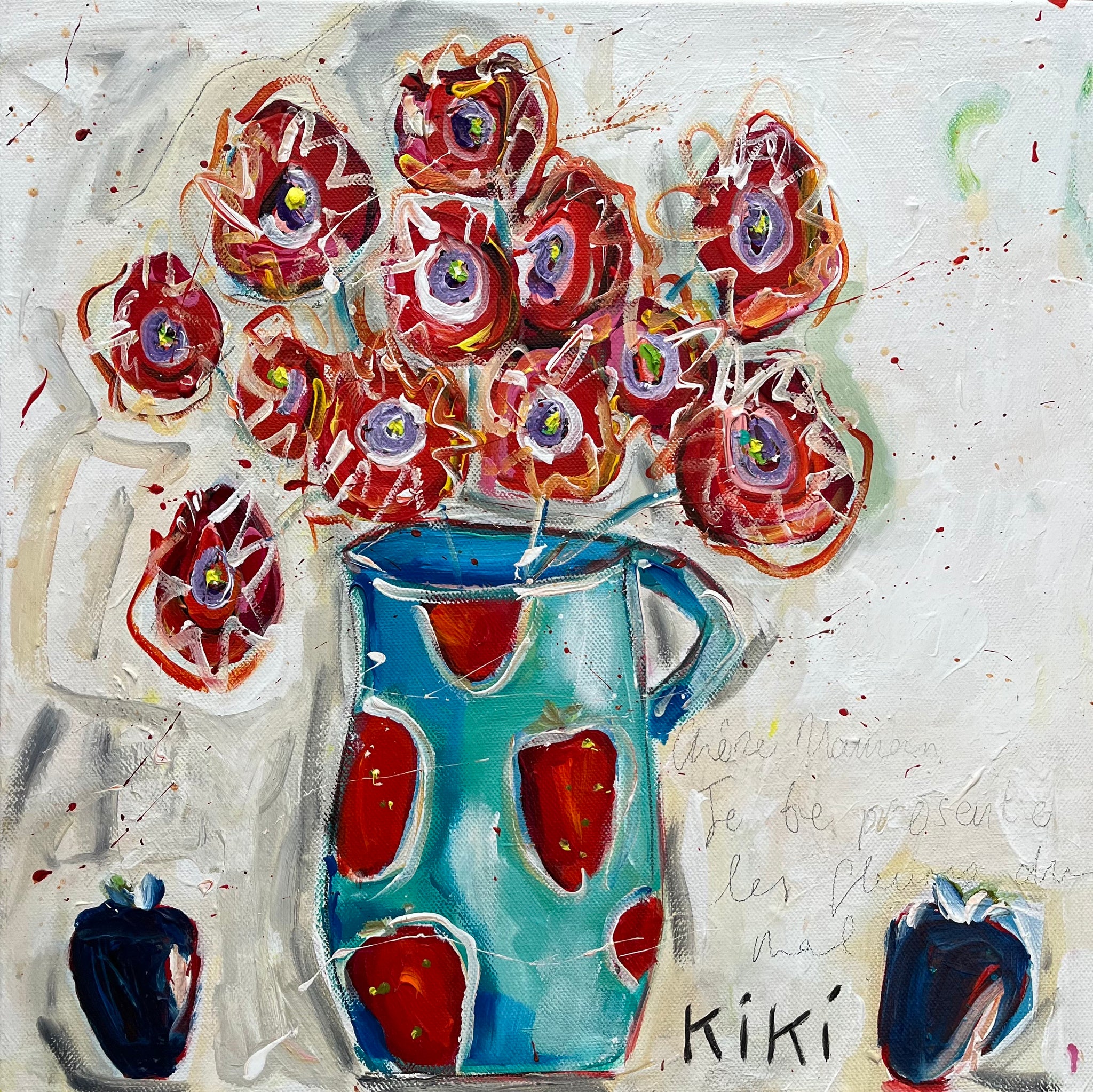 A very abstract interpretation of poppies but my interpretation nonetheless. The blue strawberries were to contrast and draw the eye to the corners, grounding this vase and its poppies that seemingly float on the white washed country cottage wall. Inscribed in scrafitti is in part, the French poem, 'Les fleurs du mal'.