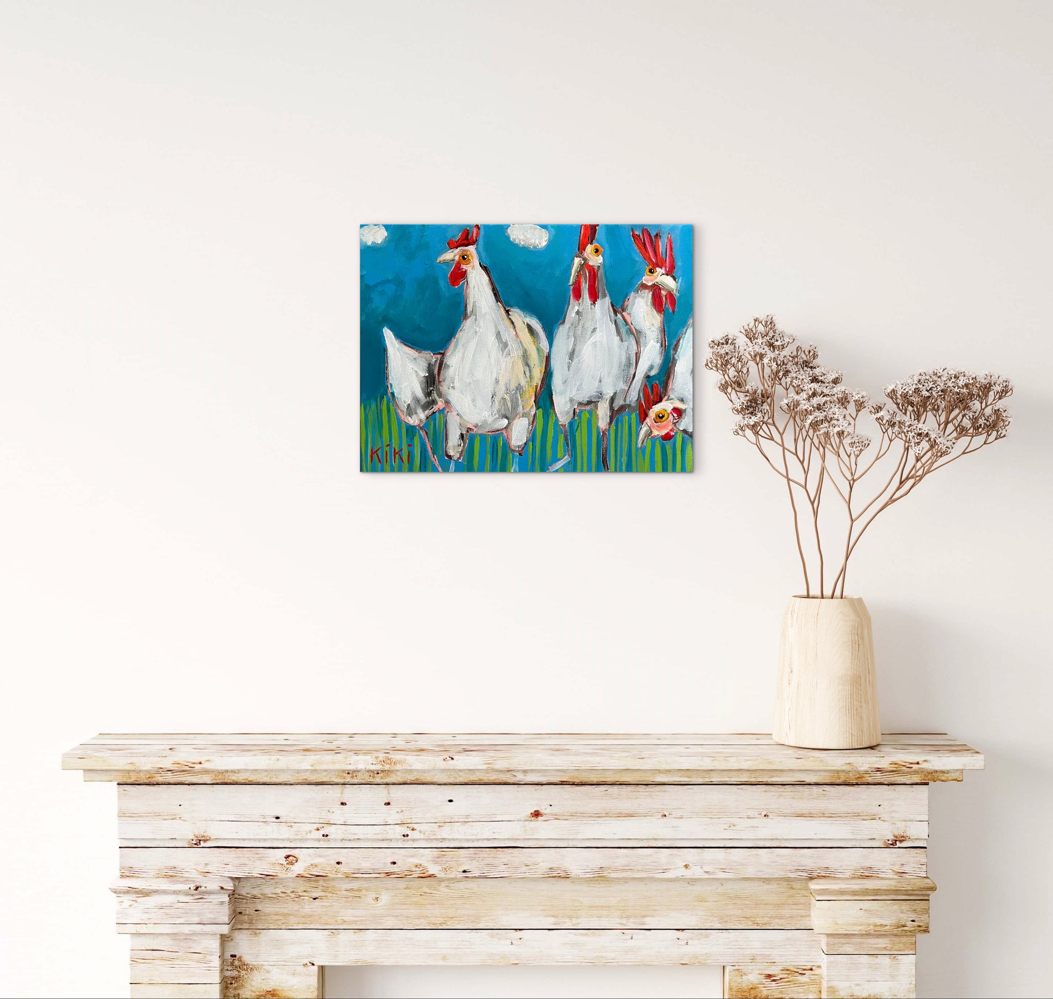 A striking yet naive depiction of this brood of hens wandering freely in the green field, beneath the idyllic blue sky